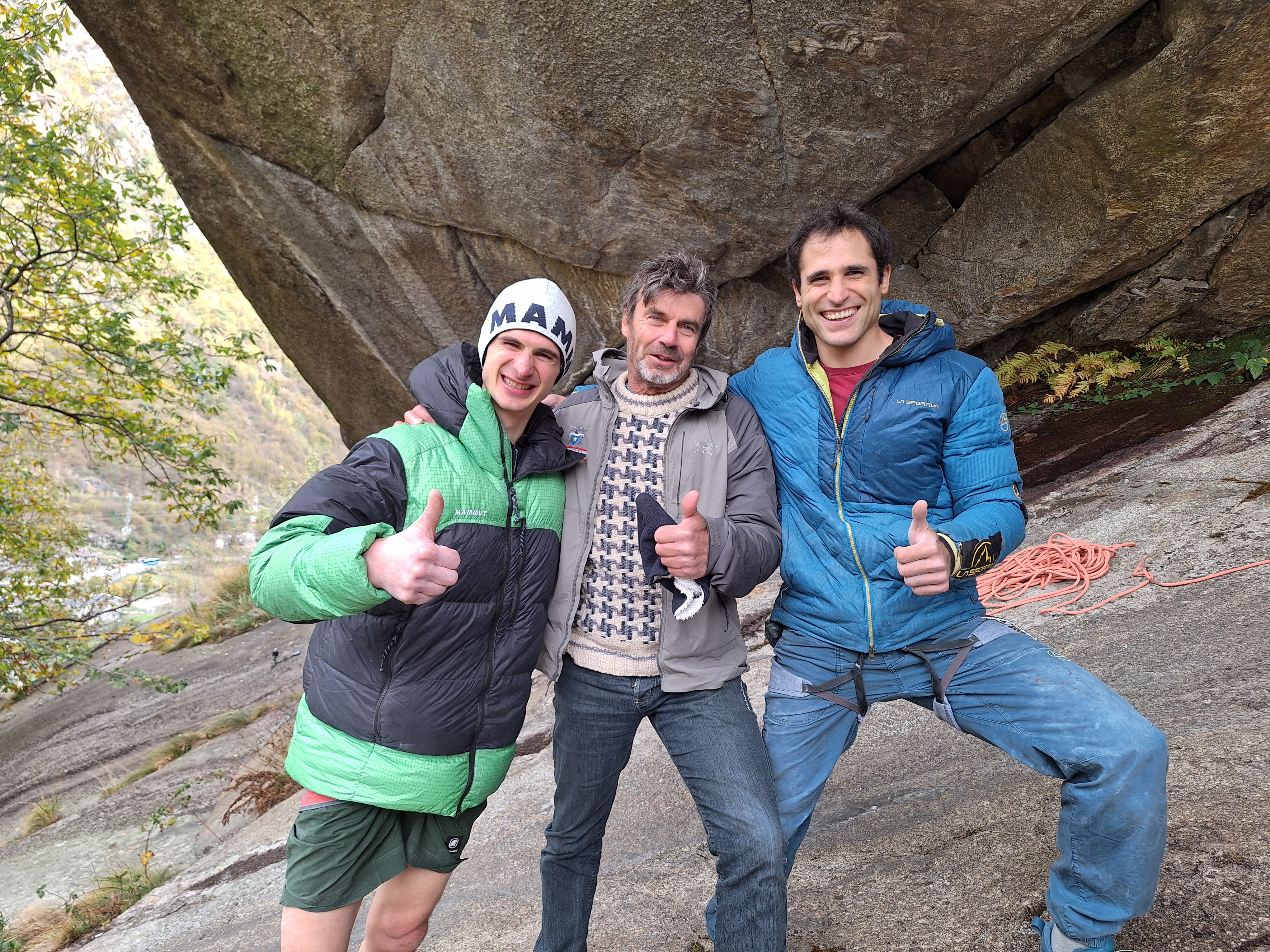 Marcello, Adam e la Film Crew arrivano a casa mia sulla piazza di Noasca. Adam è contento di aver chiuso anche la Pura Pura al primo giro, ma mi confessa che dopo il traverso era stanco e se non fosse stato per una ottima knee bar (incastro di ginocchio) avrebbe faticato parecchio. Vorrei dire...sticazzi, ma accenno come dire ...ovvio.