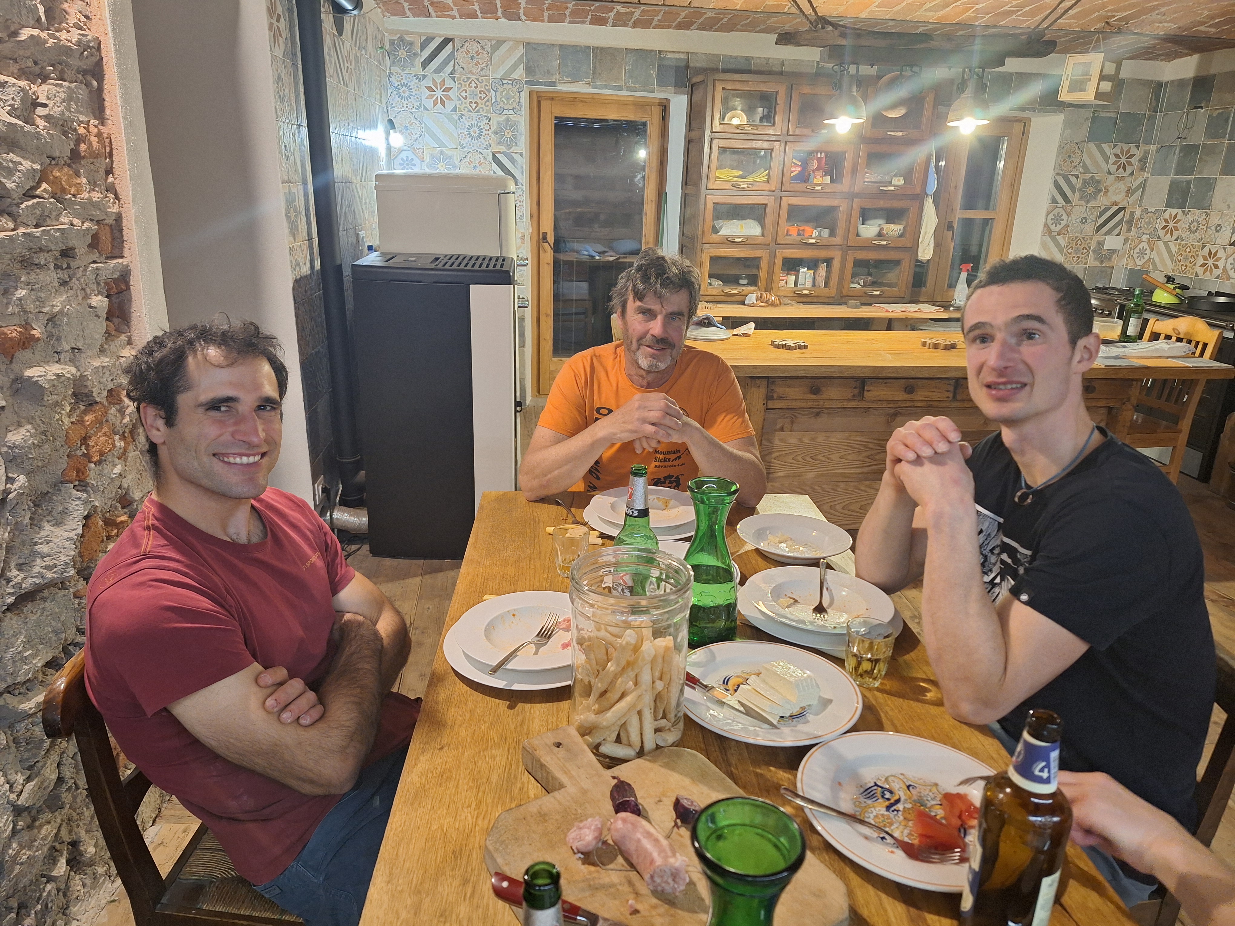 Presto risolto, mangiano di tutto, il mio kg di pasta che pensavo eccessivo viene spazzolato. Adam vede la ricotta fresca e mi chiede se puó aggiungerla al ragù, sarà d’ora in poi la Pasta alla Adam Ondra, ragù e ricotta. In realtà la ricotta l’avevo presa a Rosone per mia moglie Sabrina, ma visto che le avevo dato buca per rimanere a scalare con Adam Ondra invece che con lei, era incazzata come un puma e me l’avrebbe tirata nella schiena. Adam mi confessa di preferire il vino alla birra, da un Ceco non me l’aspettavo. Infine il Vin Santo con i Torcetti, accende le discussioni.
