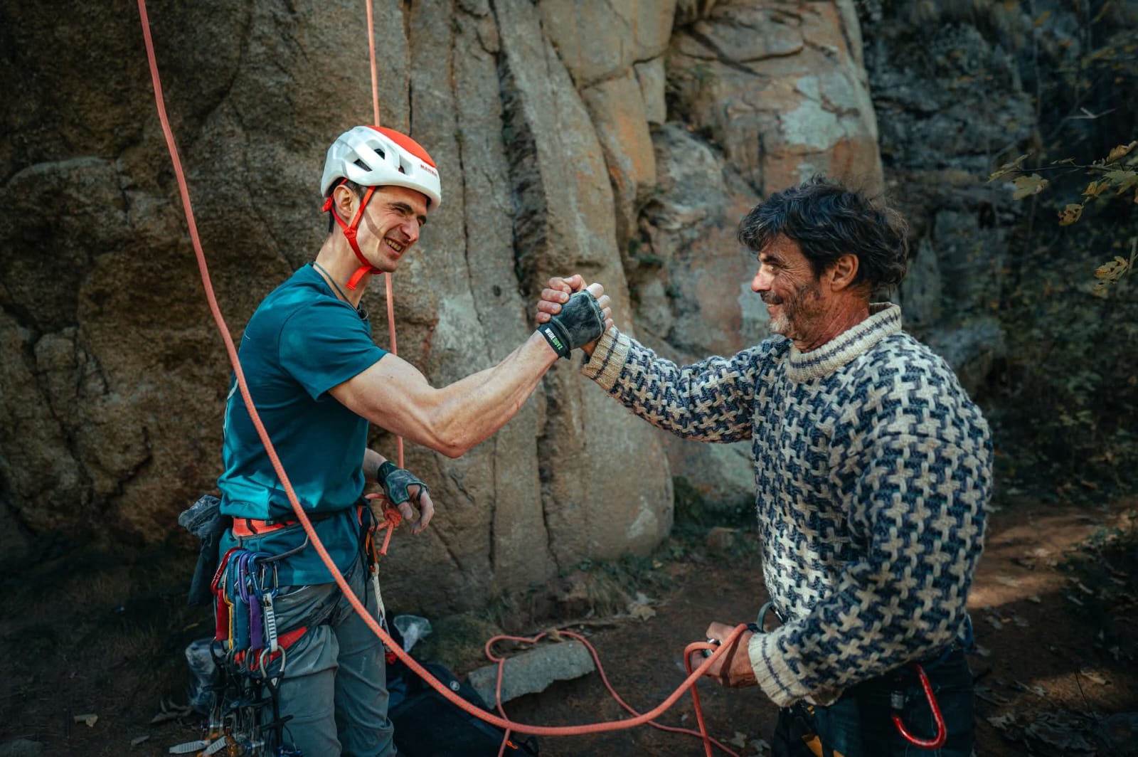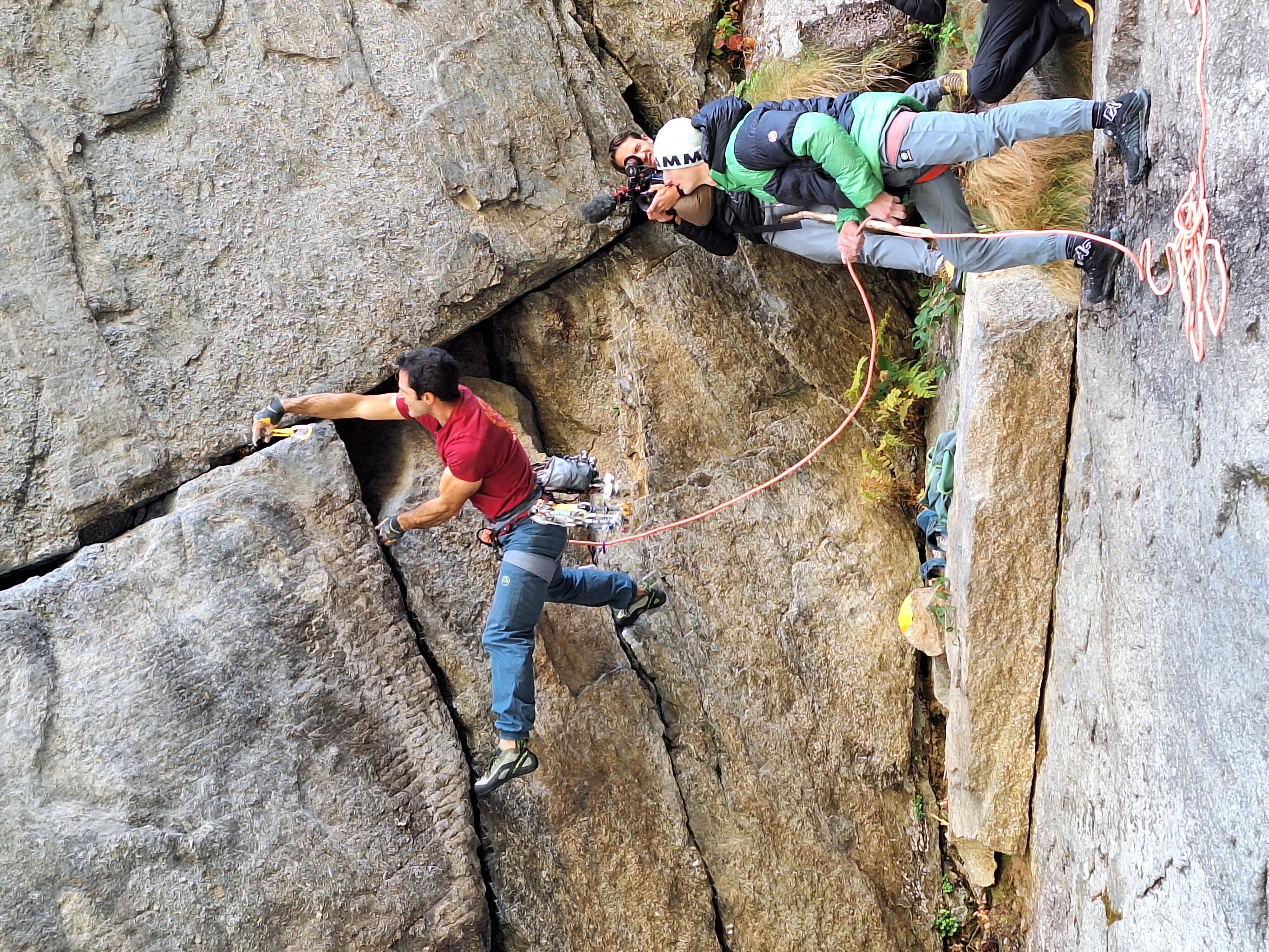 Tutto l'investimento di viaggi e giorni della troupe, dei contratti con gli sponsor di barrette (che paga il video) andrebbe in fumo. È banale dirlo, ma in quel momento è solo, non ha trucchi, è vestito come noi con un paio di scarpe consumate, per me fa anche freddo, l’atmosfera è umida, eppure lo vedo partire deciso, gli scappa anche un piede, deve anche provare gli incastri da appeso, ma non molla. In uscita mette male un friend che non entra e gli scivola lungo la corda, per noi attimi di ansia, decide, dopo una piccola esitazione di farne a meno, caccia due urli, riparte solido e con due bracciate spettacolari arriva in catena.