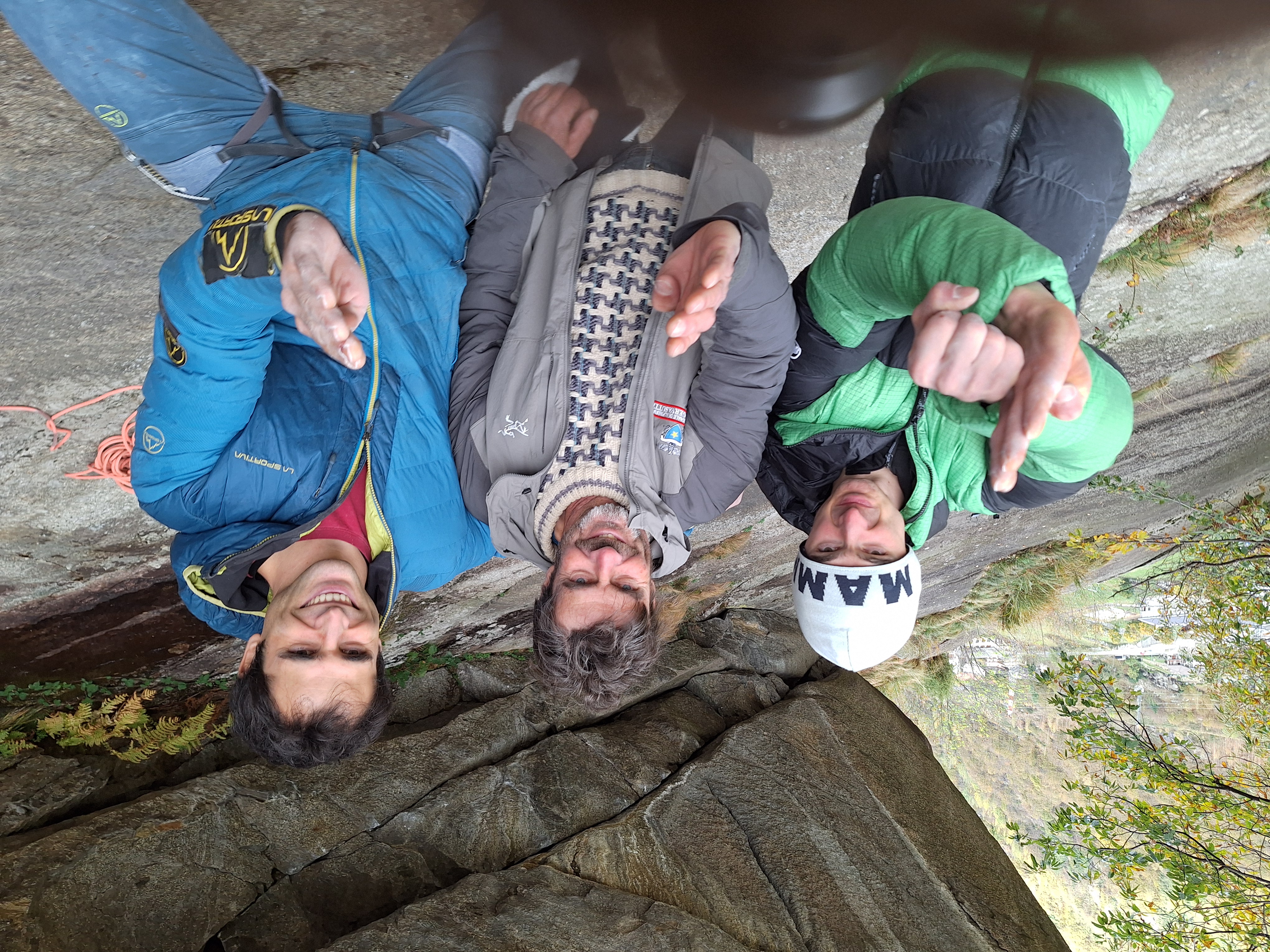 Se fosse cascato in uscita, avrebbe potuto arrivare a terra! Marcello mi dice che era pronto a correre indietro...ma comunque un solo altro friend era utile, e fiondando in strapiombo non è detto che non sarebbe uscito. La tensione si scioglie, si cala mi corre incontro e mi da il pugno e poi fa lo stesso con Marcello. Adam è un fiume, ci spiega cosa ha fatto e poi, trascinati dal suo entusiasmo, facciamo tutti e tre una foto mimando l’incastro chiave.
