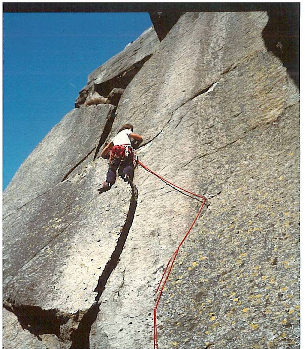 Sitting Bull era una vera fessura, scalabile solo ad incastro come quelle che vedevamo sulle foto di Yosemite. Fessure di quella difficoltà non ne erano state salite o si scalavano in artificiale con i cunei di legno o di alluminio. Nella spregiudicatezza dei vent’anni e per emulare il mio idolo californiano Chuck Pratt mi imposi di scalarla dal basso, in libera e solo con i Nut e gli Excentric.