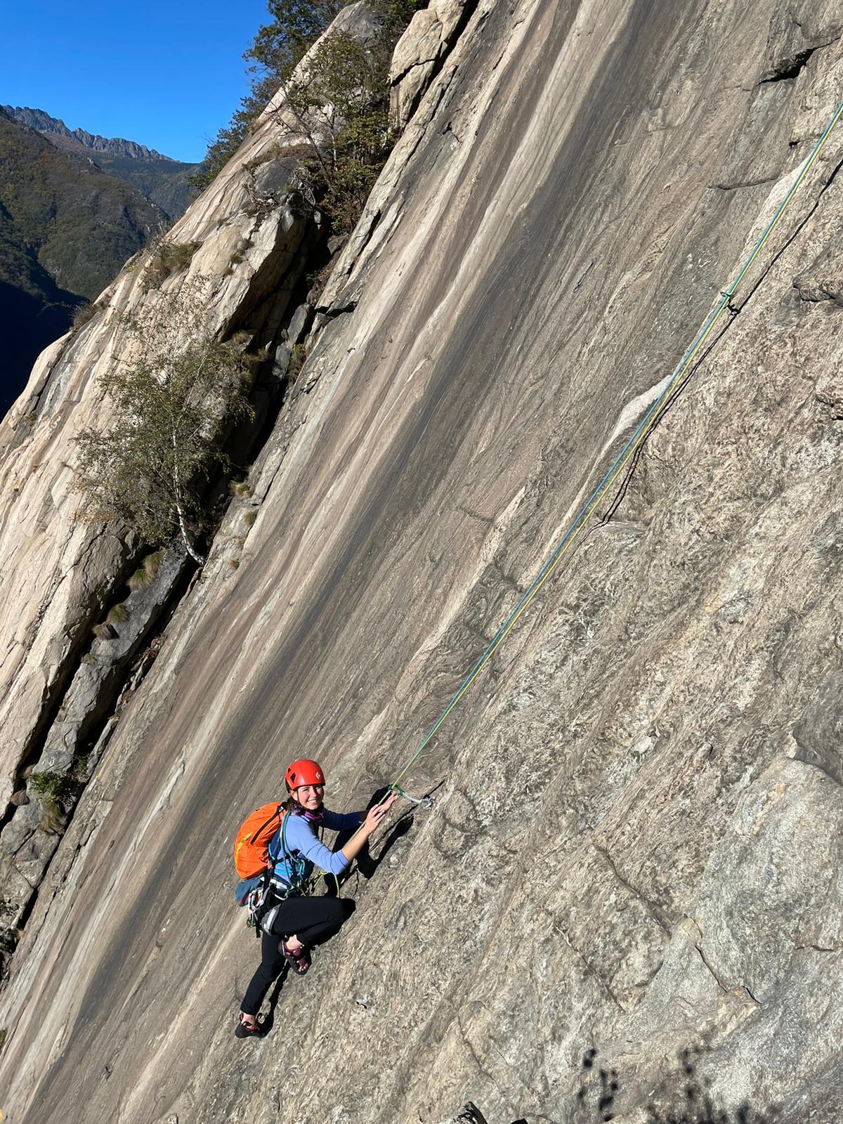 Maria, la mia allieva, ed io scopriamo una via che non se la fila nessuno, vuoi perché la partenza rimane nascosta, vuoi perché – forse – ha ancora quella nomea di “via da interpretare” (mai capito cosa voglia dire su una via di placca!!).