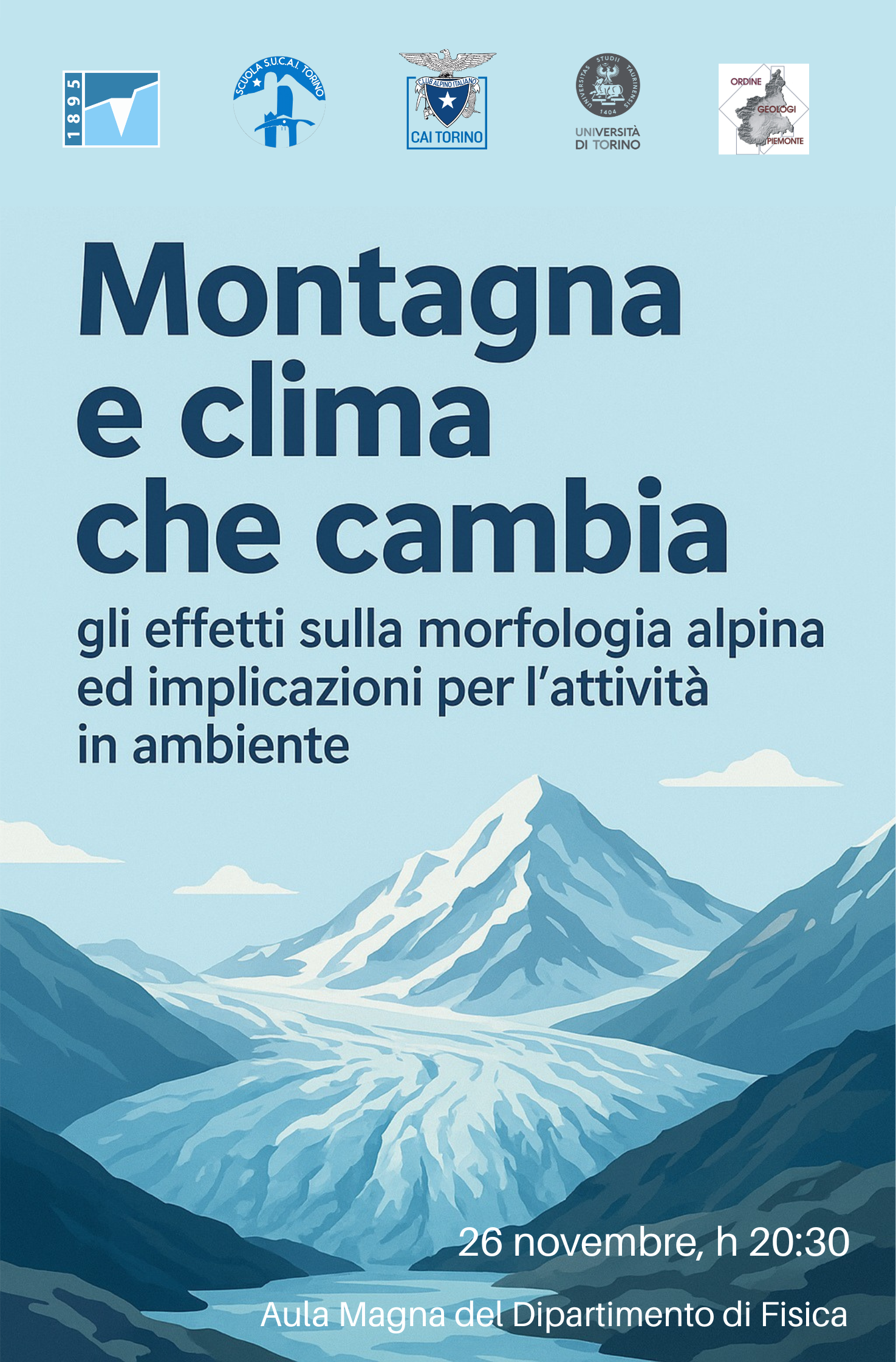 Durante l’incontro, organizzato dalla Scuola Nazionale di Sci Alpinismo SUCAI - Torino, i relatori guideranno i partecipanti in un percorso di approfondimento per comprendere i principali segnali d’allarme e le implicazioni pratiche di queste trasformazioni sulla montagna che viviamo oggi.