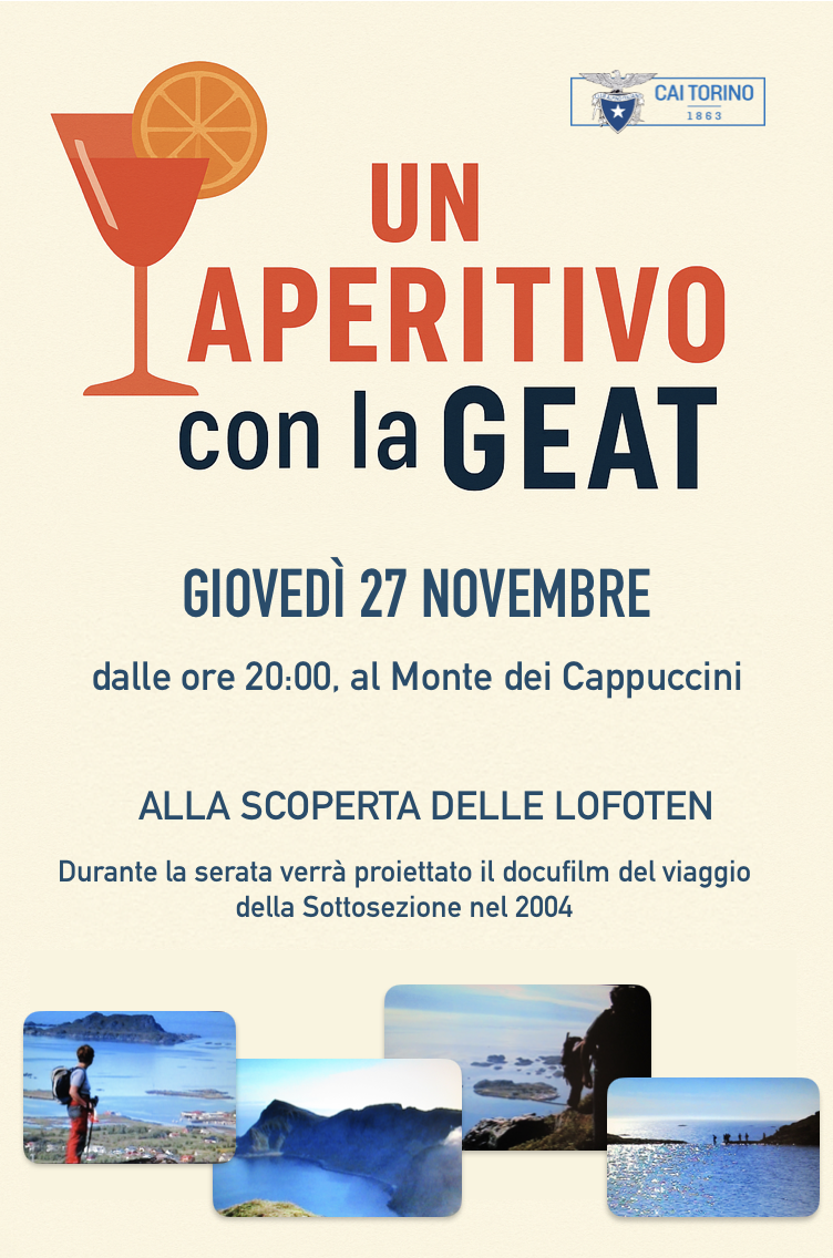 La Sottosezione GEAT vi aspetta per un aperitivo giovedì 27 novembre, a partire dalle ore 20, presso il Centro Incontri al Monte dei Cappuccini