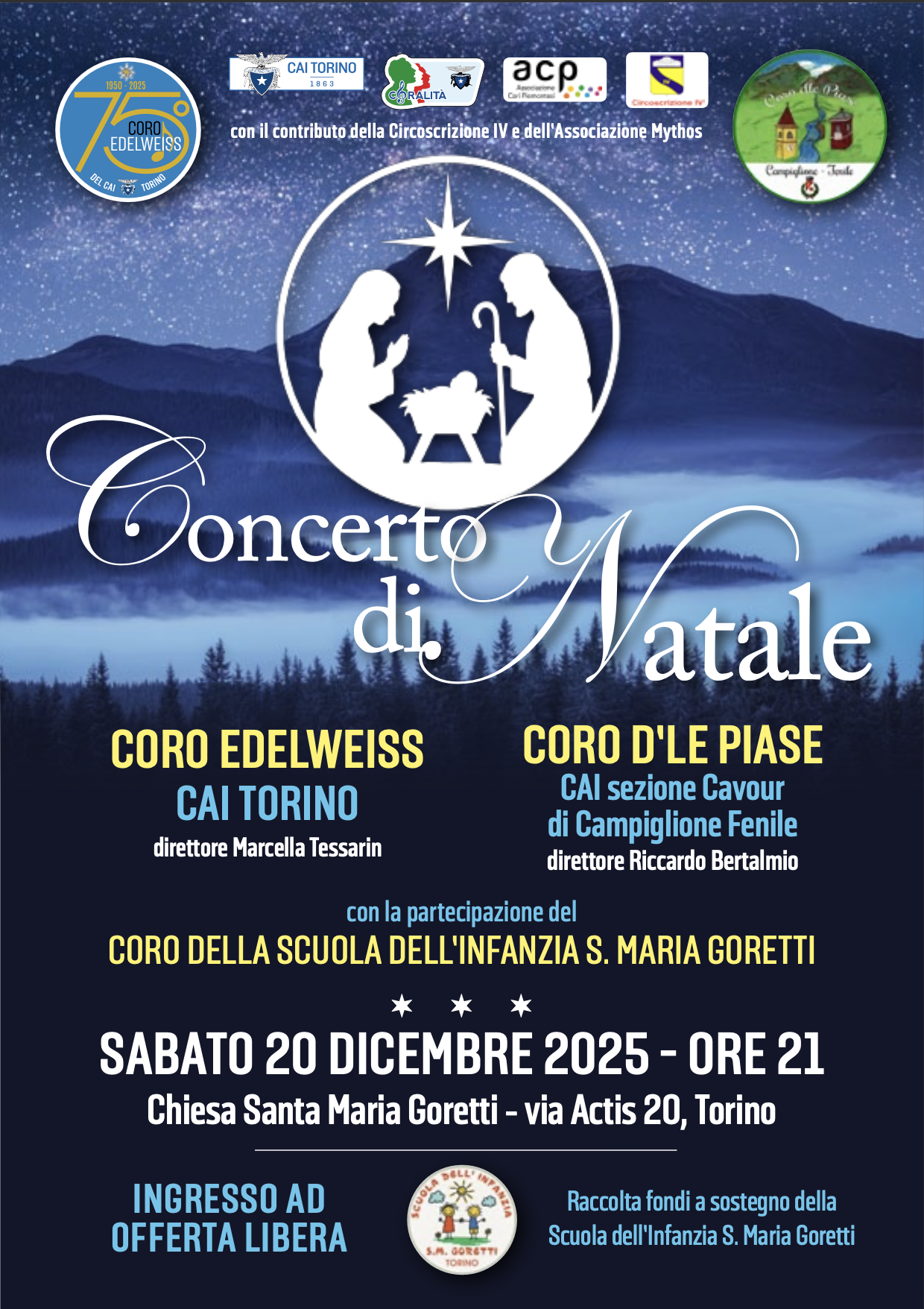 Sabato 20 dicembre, alle ore 21.00, a Torino, il Coro Edelweiss del CAI Torino invita soci e cittadini a un suggestivo Concerto di Natale, realizzato in collaborazione con il Coro dle Piase di Campiglione Fenile.