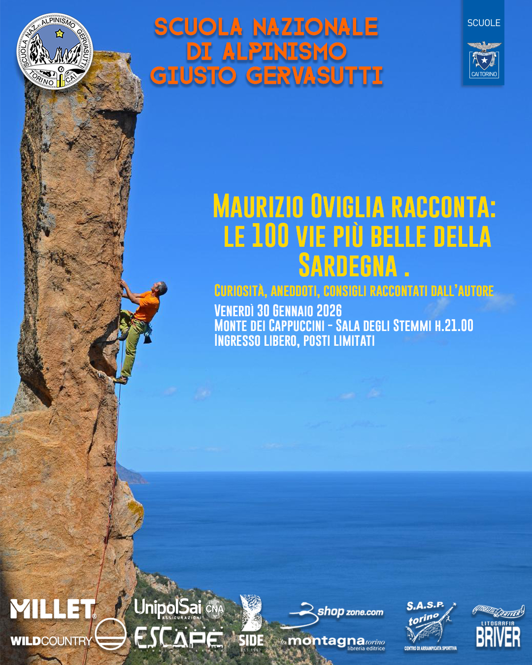 Venerdì 30 gennaio 2026, alle h 21:00, presso la Sala degli Stemmi del Monte dei Cappuccini, Maurizio Oviglia accompagnerà il pubblico in un viaggio tra le 100 vie più belle della Sardegna, raccontando curiosità, aneddoti ed esperienze vissute in prima persona. Un’occasione unica per ascoltare direttamente dall’autore consigli preziosi su itinerari, stili di arrampicata e peculiarità delle diverse zone dell’isola.
