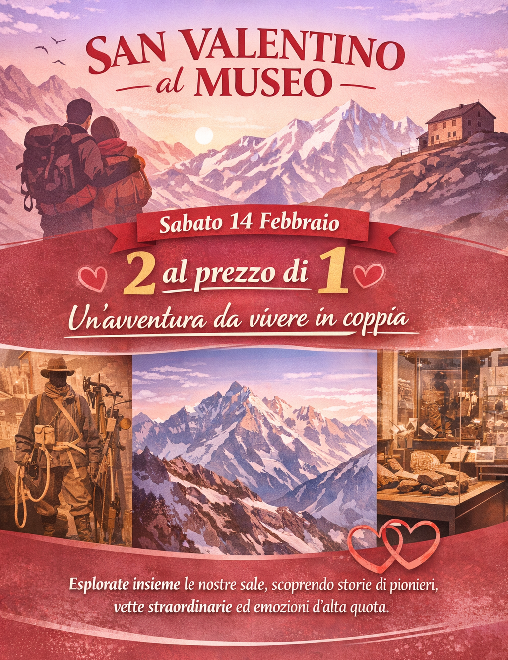 Condividere esperienze è parte essenziale dell’amore, così come dell’andare in montagna. Per questo vi invitiamo a vivere insieme un percorso tra le sale del museo, alla scoperta di storie di pionieri e grandi imprese alpinistiche, della bellezza delle vette, delle emozioni dell’alta quota e dei valori che da sempre uniscono la comunità della montagna.