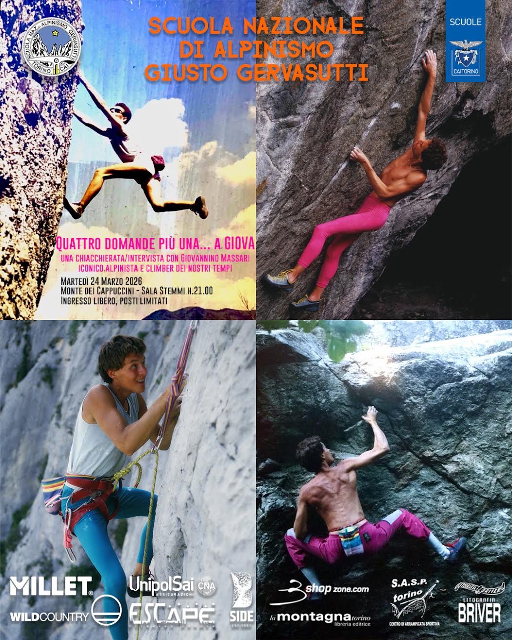 La Scuola di Alpinismo G. Gervasutti del CAI Torino organizza una serata speciale dedicata al racconto dell’alpinismo contemporaneo: “Quattro domande più una… a Giova”, una chiacchierata/intervista con Giovannino Massari, tra gli alpinisti e climber più iconici dei nostri tempi.