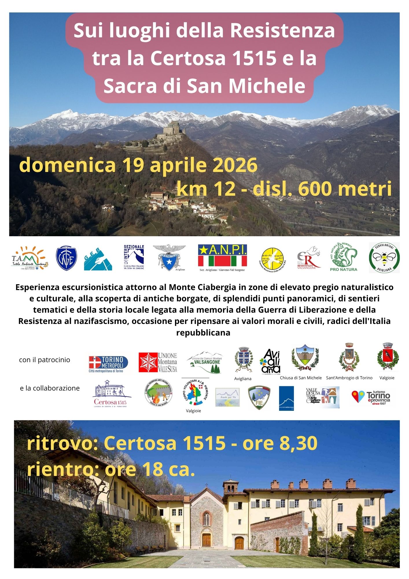 Il percorso si sviluppa tra la Certosa 1515 e la Sacra di San Michele, luoghi emblematici che fanno da cornice a un itinerario dedicato alla memoria della Resistenza e della Guerra di Liberazione.