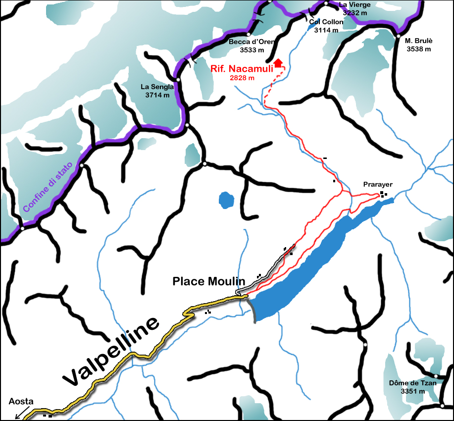 dalla Diga di Place Moulin in Valpelline con sentiero in 3 h 30'. Lasciata l'auto nell'ampio parcheggio nei pressi della diga di Place Moulin (1960m) ci si avvia sulla strada poderale che conduce al Rifugio Prarayer. Dopo pochi metri si incontra una biforcazione (2004m): tenere il sentiero 8 che diparte sulla sinistra. L'ampio sentiero risale a mezza costa il versante orografico destro del lago di Place Moulin, attraversa un rado bosco di larice e passa nei pressi una costruzione in pietra. Dopo aver superato un piccolo torrentello su una passerella in legno, il sentiero piega verso sinistra sino a raggiungere una pista molto larga: la si prende verso destra e poco dopo si incontra un'altra biforcazione (tenere la destra seguendo le indicazioni Collon scritte in rosso). Pochi minuti dopo si raggiunge l'Alpe di Arpeyssaou (2125m, 0h25'). Superato l'alpeggio si raggiunge un grosso spiazzo, dopodiché la pista si restringe sino a divenire nuovamente un sentiero. Si attraversano nuovamente macchie di larici risalendo per qualche decina di metri, con un paio di tornanti, per poi iniziare un tratto di discesa che ci porta al bivio con il sentiero che porta a Prarayer (2215m, 1h00'). Si tralascia chiaramente il sentiero per Prarayer (sulla nostra destra) per iniziare a risalire un breve pendio erboso su di un comodo sentiero: davanti a noi si erge l'imponente mole della Gran Vanna. Lungo il cammino si supera un rudere e si raggiunge l'Alpe d'Oren (2161m, 1h30'). Superato l'alpeggio il percorso prosegue nel vallone tra pascoli e pietraie al cospetto della Sengla; poco prima dell'Alpe Garda (2211m) si attraversa il torrente e si proseguirà la risalita della comba sulla sua sinistra orografica. Dopo circa 2h15' si raggiunge l'ampia conca sabbiosa del Plan du Gan (2450m) da qui il sentiero incomincia a risalire ripidamente nella gola del Pissonet: questo tratto è stato attrezzato con corde e catene ma la difficoltà non è comunque elevata. Superata la gola il tracciato riduce la sua pendenza e, dopo aver superato un grosso ometto di pietre, si attraversa il torrente e si prosegue senza troppa difficoltà verso il vecchio rifugio Collon (2818m) e il nuovo rifugio Nacamuli (2828m). Il ritorno si effettua sullo stesso itinerario dell'andata.